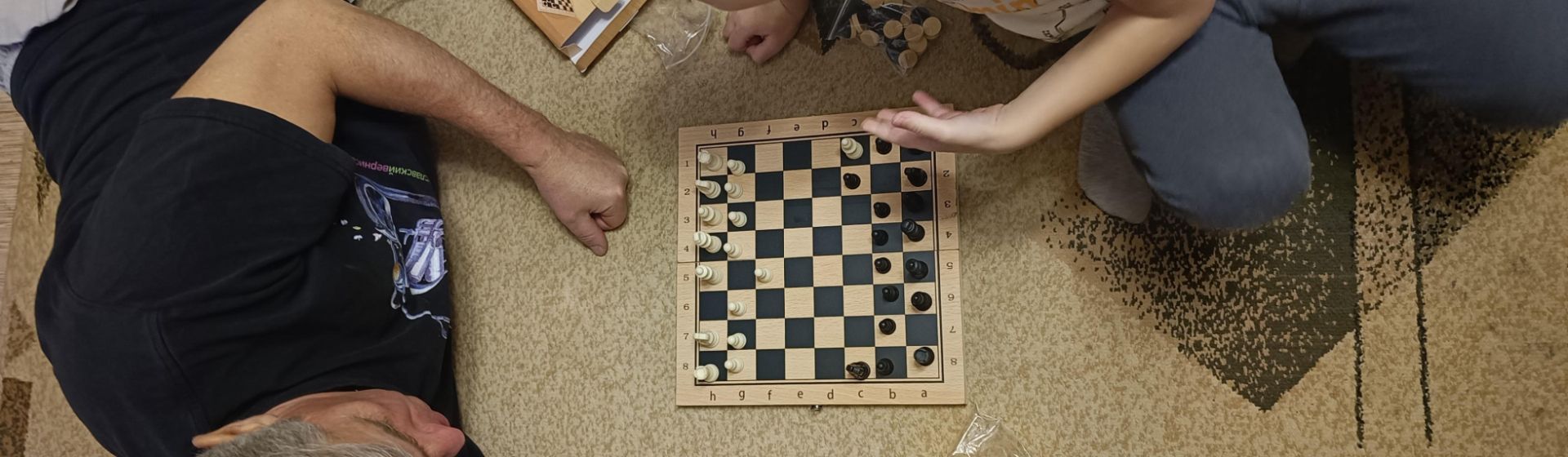 И вот они дома. Миша сам снял защитную плёнку, вынул игру из упаковочной коробки. Всё цело, без повреждений. Игровые фигуры упакованы в ЗИП пакеты. Увидев шахматные фигуры, сын забыл, что ждал шашки. Шахматы он видел в одном из торговых центров, где в проходе между торговыми павильонами нарисовано большое игровое поле, а на клетках красуются фигуры. Там всегда бродят детки и перетаскивают их с одной клетки на другую.