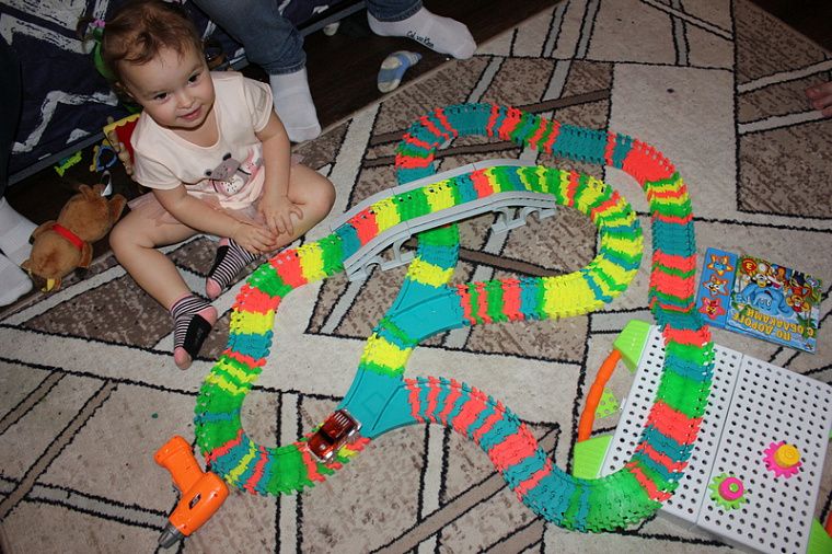 Только с папой можно устроить гонки по всей комнате. Дорогу делают с препятствиями, мостами, тоннелями из коробок, перекрёстками и крутыми поворотами. Две машины должны ехать в противоположных направлениях так, чтобы не столкнуться. Ребёнку нужно проявить ловкость и смекалку, чтобы вовремя открыть стрелку на перекрёстке в нужную сторону. В эту игру ребёнок может играть до получаса, бывает и дольше. На сборку трека уходит немало времени, но увлекательные гонки стоят того.