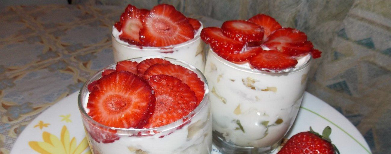 Четвёртый слой – нарезанные бананы, смазываем слой сметаной и посыпаем орехами и сверху пятым слоем кладём клубнику. Ставим в холодильник на 1- 2 часа. Десерт готов.