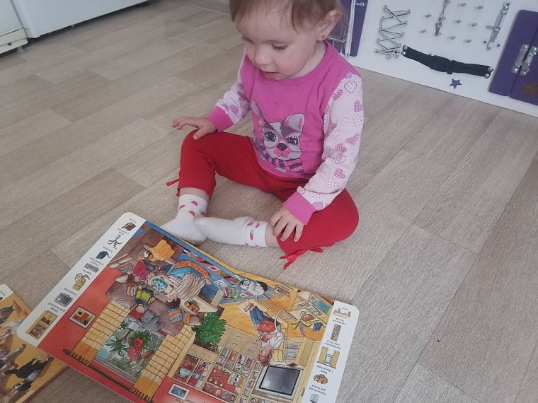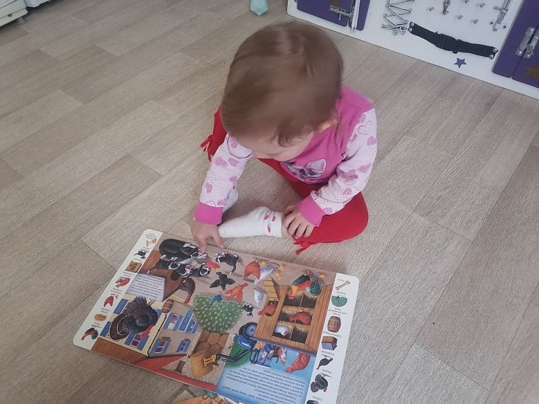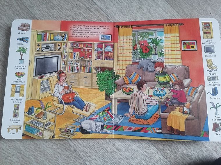 Дочь подружилась с книгой сразу. Я показала ей на картинках папу, маму, братика и сестричку. Она сразу сообразила, кто есть кто, и на каждом развороте стала искать знакомых персонажей, кроме того, пытается рассказывать, кто и что делает. Действительно, множество мелких деталей привлекает внимание ребёнка. Можно попросить малыша найти какой-нибудь предмет, описать его. Можно придумывать целые истории про каждого персонажа.