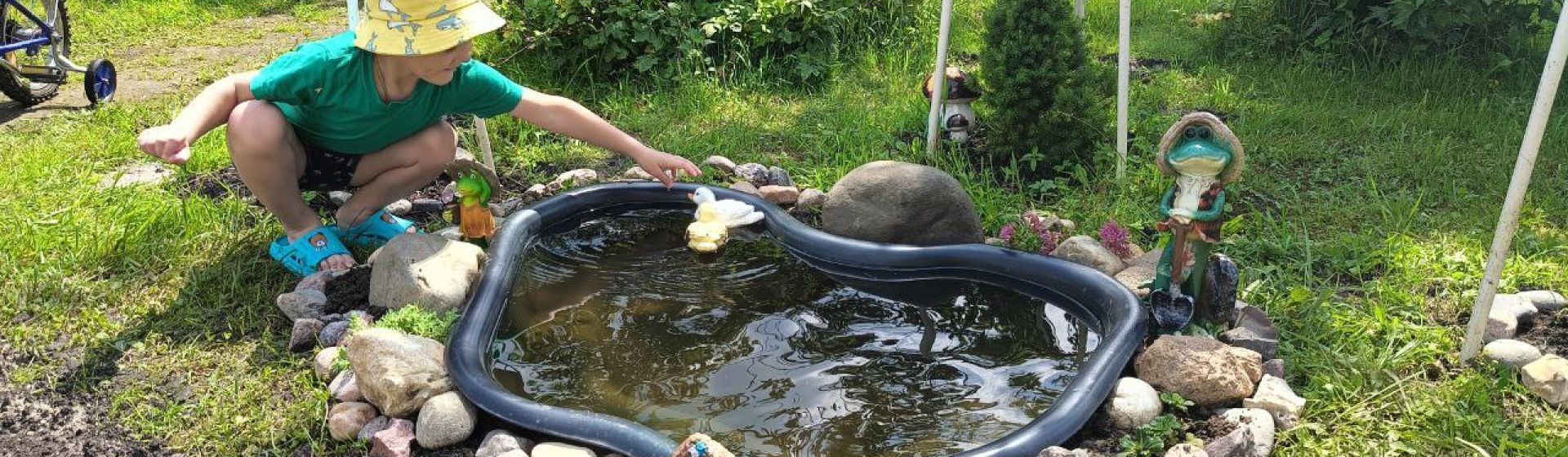 Он ещё не совсем доделан, т.к. стоит очень жаркая погода и вокруг водоёма не посадили ещё все растения, которые планируем.