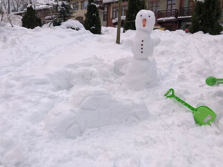 Ещё мы очень любим строить из снега домики, а потом в них залезать. Домик обычно строить любит папа, а дети ему активно помогают: катают снежный ком, лепят домик, укрепляют его. Когда снег липнет, интересно лепить снеговиков, детям очень нравится. А чтобы не замёрзнуть, можно поиграть в снежки.