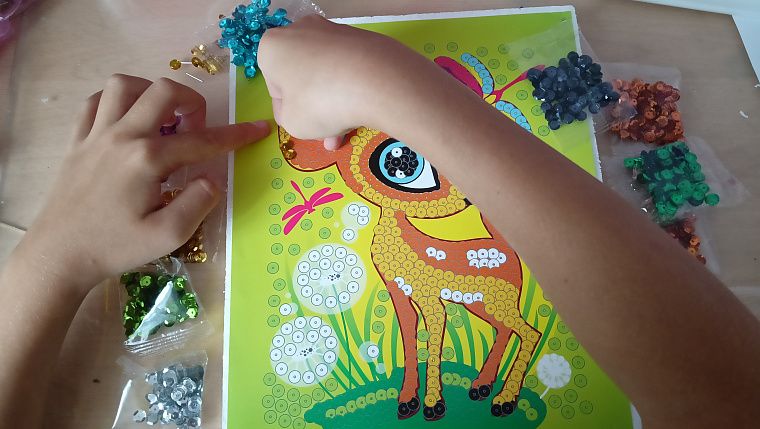 Мы с дочкой очень любим заниматься творчеством. Перепробовали к еë восьми годам практически все поделки, которые представлены в магазинах. Но детям всё же постоянно что-то надо, когда прогуливаешься по торговому центру. Так и у нас. Практически все развлечения мы попробовали, но маленькая ручка всë равно тянется за покупками. Вот и пытаемся найти что-то новенькое и интересное.Картины из пайеток – это далеко не новинки. Дочка была с ними знакома, мы их уже делали вместе, и потом она дарила свои творения воспитательнице в детском саду. Поэтому когда она выбрала очередную картину из пайеток, то я была не в восторге. Почему? Мне предыдущая подобная сверкающая поделка показалась очень лëгкой. В ней пайетки приклеивались на липкий слой, их на всю картину было крайне мало. Детям помладше она подошла бы хорошо, но моей была уже простовата. Однако дочке уж очень понравился рисунок, я сдалась и взяла.