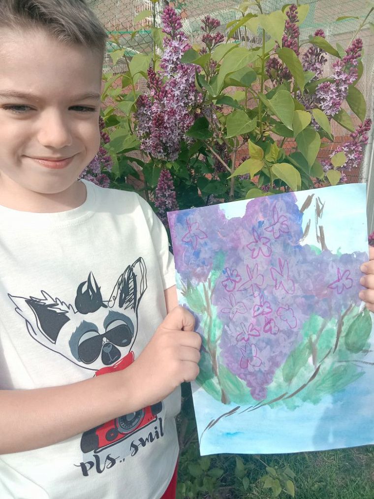 Мы живём с семьей в большом селе Подстёпки. Оно располагается в 15 минутах от города Тольятти. У нас есть собственный сад и огород. Мы часто делаем закупки саженцев и цветов в большом питомнике растений, который находится недалеко от нас. В очередной раз, когда мы поехали туда все вместе, нам рассказали, что у них проходит конкурс детских рисунков, приуроченный как раз ко Дню сирени. Сын решил поучаствовать. Приехав домой, мы приступили к творческому процессу.