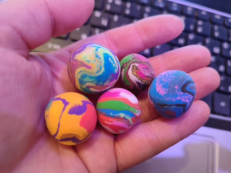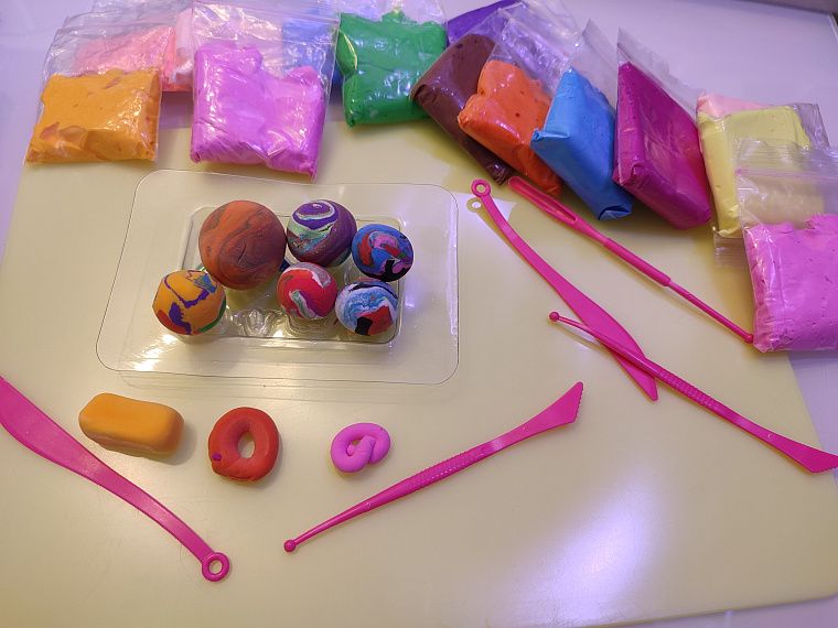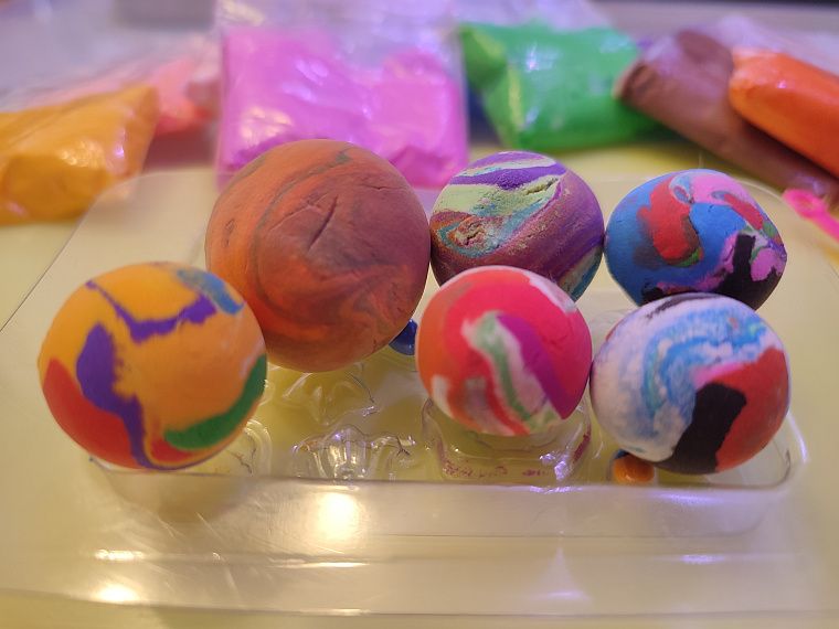 И что же делать с таким творчеством? После слепленного с огромным удовольствием третьего бочка я с ужасом представила полки, заставленные шариками, которые выкинуть нельзя. Дочь каждое утро пересчитывала их. Воздушный пластилин высыхает за ночь, можно играть и катать бочки, не боясь, что они потеряют форму. Единственный минус воздушного пластилина, что он может расколоться, становится хрупким после высыхания.