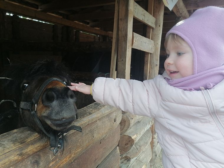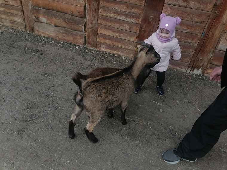 Дети вдоволь «пообщались» с пернатыми обитателями и парнокопытными животными: овцами, кабанами, телятами. Особенно всем понравились козы. Они настолько ручные, что ходят по всей территории, вне вольера. За нами увязались несколько козлят, которые так и норовили пожевать нашу одежду или засунуть свои мордочки в сумку. При этом морковь, хлеб и яблоки, которые нам выдали на входе, их не очень интересовали – значит, животные сыты.