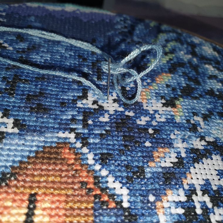 По мере взросления сына и более-менее определённого режима дня, я решила, что можно попробовать продолжить вышивать. Привезя картину домой, я обнаружила, что не хватает одной части схемы. Сначала было желание всё бросить и купить новый набор, но потом я подумала, что кроме меня никто не занимается вышиванием и ту схему не мог взять. Я решила, что продолжу вышивать, а ту часть найду позже.