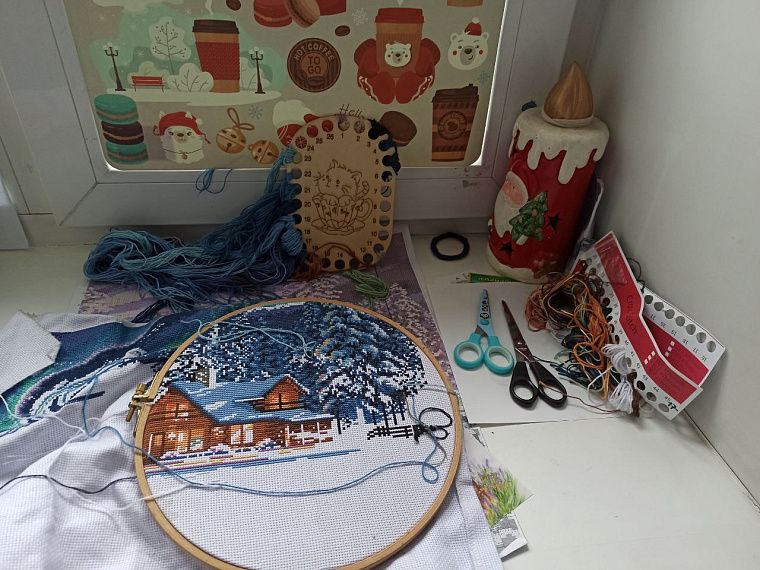 Потом я уехала учиться в другой город и 3 года не вышивала. Следующую картину я приобрела, собираясь в декрет. Многие знакомые говорили, что новорожденные дети первые несколько месяцев кушают и спят, и, возможно, мне даже будет скучно, поэтому я решила, что буду заниматься любимым хобби в свободное время. Тогда я не знала, что это не про моего ребёнка.Находясь в ожидании, было много свободного времени, и я понемногу начала вышивать. Но так как долго сидеть мне было неудобно, к рождению сына я вышла лишь небольшую часть. Когда родился мой сын, ни дня не было, чтобы мне было скучно. Он не спал большую часть времени, поэтому про картину пришлось забыть. Я оставила её у родителей, думала, так будет надёжнее.