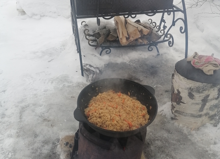 Наш с дочкой вечер прошёл за подготовкой к фестивалю – за приготовлением плова. Люблю такие вечера, когда мы с детьми занимаемся чем-то вместе. Погода позволила нам готовить в казане на открытом огне. Было достаточно тепло и без ветра. Плов получился вкусным, а вечер душевным. Для блюда дочка взяла с собой в школу специальную тарелку – ляган и одноразовую посуду для дегустации.