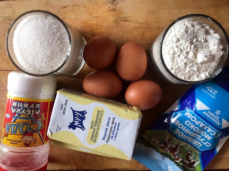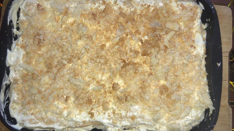 Первый торт делали из покупного слоёного теста. Рецепт крема очень простой: 1 банку сгущённого молока взбить с пачкой сливочного масла. За 2-3 часа до подачи на стол достать из холодильника. Торт по вкусу получается похожим на «Наполеон».