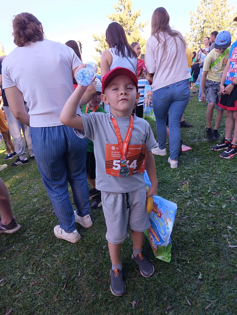 Миша сказал, что в следующем году он побежит ещё и обязательно попадёт в тройку лидеров, а пока он тихонько рассматривает свою медаль и хомячит вкусняхи.