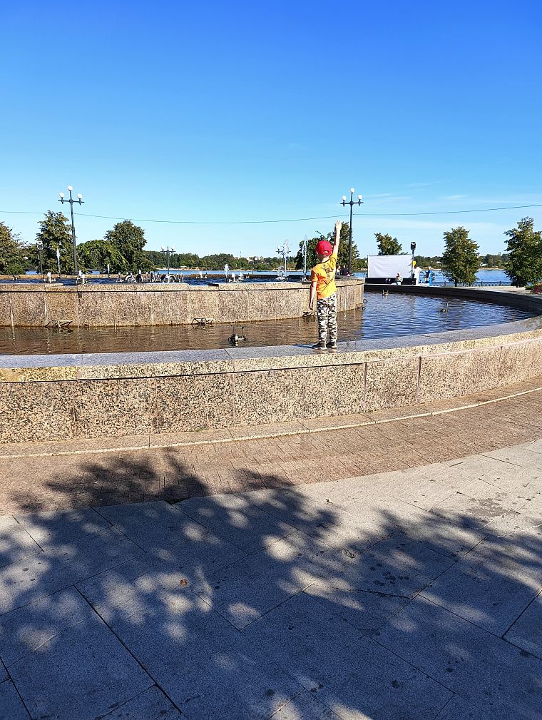 За день до мероприятия мы поехали получать стартовые пакеты. Жизнь на Стрелке кипела вовсю. Разбили несколько палаточных городков, поставили ларьки с сувенирами, выставляли сцену и многое другое. После получения номера мы решили прогуляться и остановились у фонтанов.