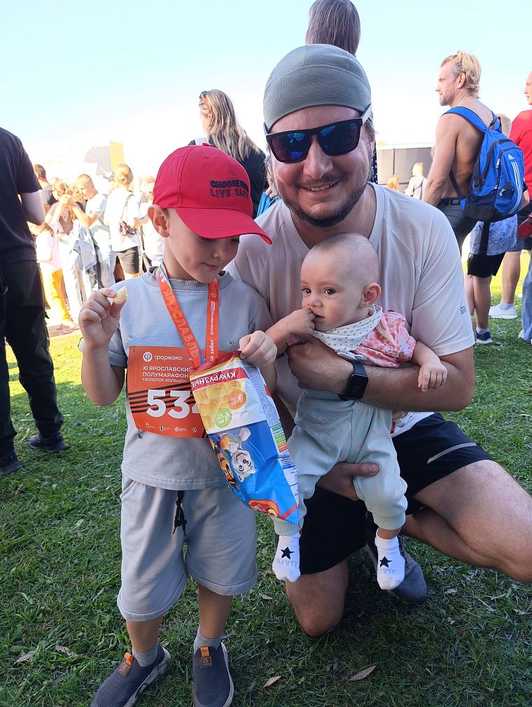 Папа отвёл Мишу к остальным участникам, бабушке выдали коляску, ну а я с Милой на руках (до этого она спала всю дорогу) пошли снимать на видео нашего спортемена. На старт… И вот бежит наш маленький чемпион свои 300 метров среди таких же малышей и ребят постарше, ведь эта дистанция предназначена для детей от 4 до 11 лет. С таким задором он бежал вперёд, у меня даже слёзы выступили на глазах. И вот наш герой на финишной прямой, его встречают с медалью и огромным пакетом вкуснях. Мишка бежит обниматься, и ножки уже совсем не болят.
