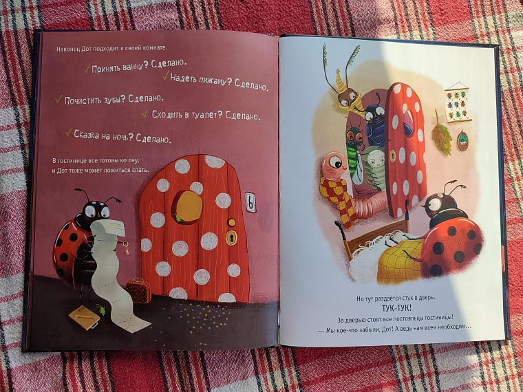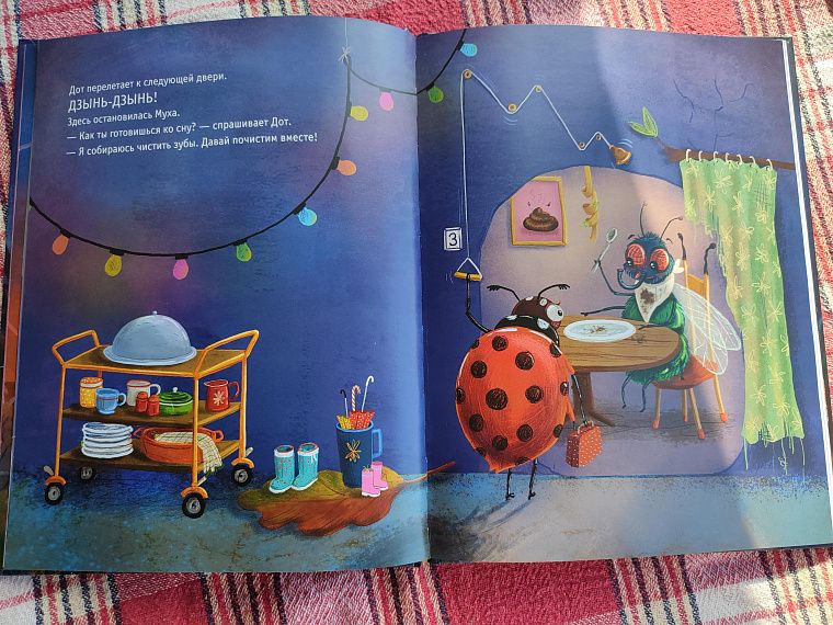 Книжка про насекомых, которые помогают детям запомнить последовательность, как правильно готовиться ко сну. Конечно, у меня возник вопрос, почему букашка Дот не может сделать все процедуры с одним кем-то, а стучится во все двери. Но дочь была в восторге, с каждой страницей – новая комната и новое действие.