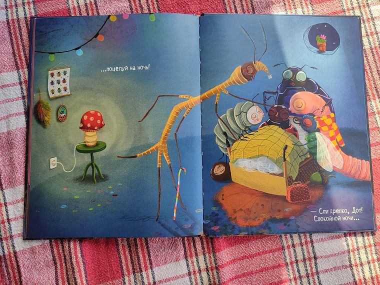 Главное в этой книге, что мы не только ещё раз проговариваем ритуалы, но и изучаем насекомых, смотрим на их домики, расширяем кругозор. А ведь так здорово: с одним почистили зубы, с другим приняли ванну, с третьим выбирала пижаму, а четвертым сходила в туалет, с пятым почитала книгу. Сказка тоже показывает: книжный червь любит читать несколько книг сразу. Насекомые, оказывается, как и все дети, любят читать одну книгу, потом ещё одну, главное – не закрывать глаза и не засыпать.