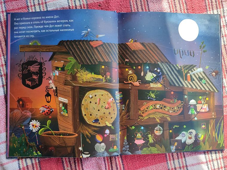 Книжка про Барашка Бяшу уже стала дочери неинтересной, ведь она рассчитана совсем на малышей. Простые, хоть и яркие картинки. Увидев у таких же мам, увлечённых воспитанием и развитием детей, книгу «Отель у букашки», я не выдержала и заказала.