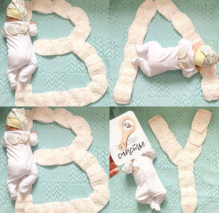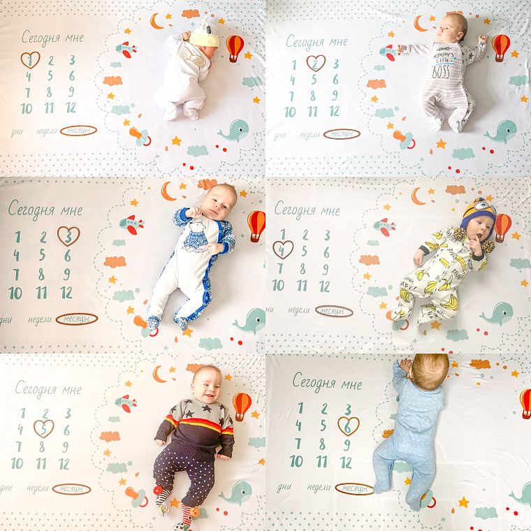 1. Тематические фотосессии первого года малыша по месяцам. Для этой фотосессии можно подобрать очень много вариантов: бенто-торт с надписью, цифры из сладостей, фруктов, картона и прочего материала, можно использовать наклейки на одежду с надписями месяцев. В нашем же случае на каждый месяц сына я делала две фотографии. Первую – с помощью фотопледа, на который нанесены месяцы и даты.