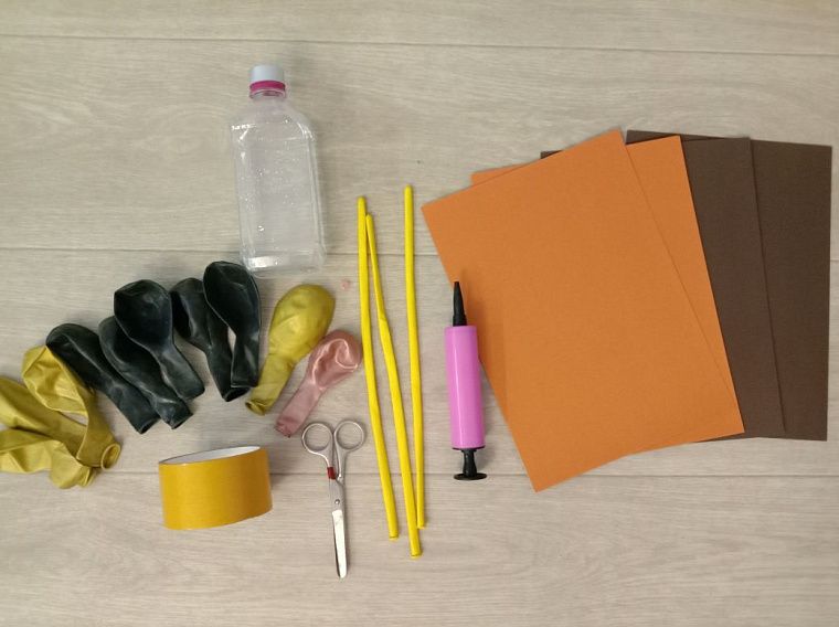 - 3 или 2 шара одного цвета для моделирования (ШДМ - шары для моделирования). Для лап и для связи других шаров. У меня это жёлтый. Вместо шаров ШДМ можно использовать обычные надувные шары, картон. Или просто нарисовать лапы на туловище. Здесь всё зависит от вашей фантазии.