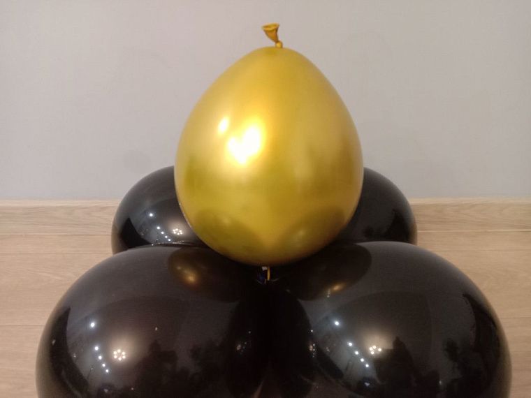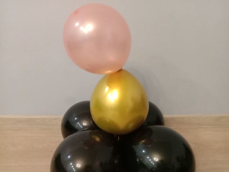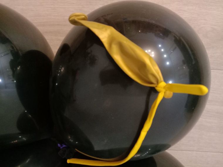 Надуваем золотой шар и завязываем его. Теперь часть, где у нас завязана пуговица, связываем с шарами основания.