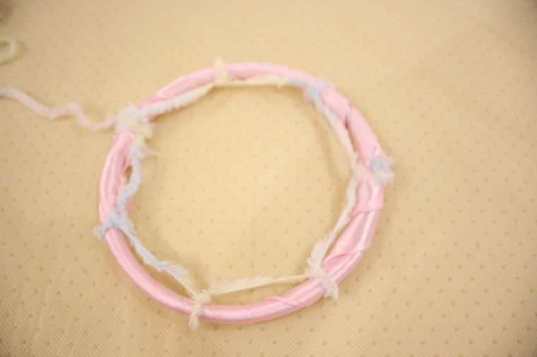 - Каркас плотно обмотать атласной лентой. Отмерить ровные части на кольце, начать плетение. На отмеченных мелком точках завязать узлы, чтобы они были в чётко обозначенных местах. Первый ряд закончен.