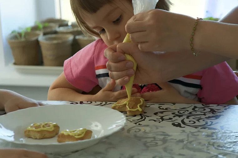 Обычно я взбиваю айсинг для украшения печенья, но в этом случае выбрала самый простой вариант: купила уже готовую цветную глазурь, которую нужно только разбавить водой. Такую смесь очень удобно разводить и заливать в кондитерский мешок. Сделала отверстия в мешках и раздала детям, чтобы они нарисовали контуры на печеньках. Все малыши терпеливо ждали своей очереди и передавали мешочки с глазурью.