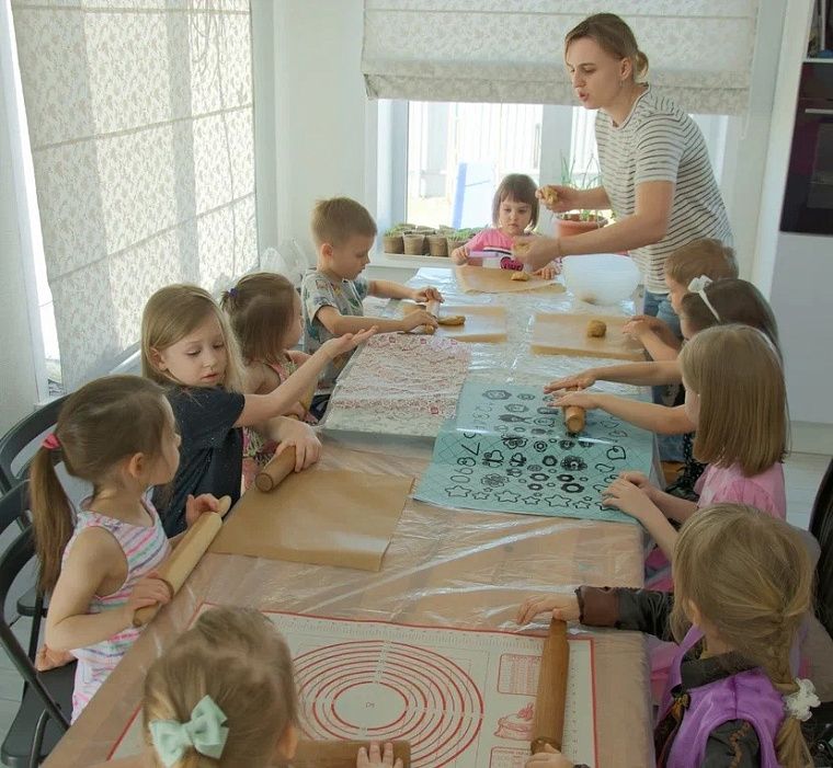 В общем-то, приготовить печенье можно по любому рецепту. Главное, чтобы было песочное тесто, которое дети смогут сами раскатать. Всех мам я попросила захватить с собой скалки и силиконовые коврики, чтобы дети могли сами раскатывать тесто. Его приготовила я сама – своё любимое, медово-имбирное. Разделила на шарики по количеству детей и раздала малышам. Все с удовольствием раскатывали пласты для вырезания печенья.