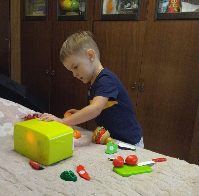 Казалось, что всё у нас есть. Но только казалось. Миша подрос, и ему стало интересно на кухне всё, а особенно столовые приборы и микроволновая печь. Как же хорошо, что создатели игрушек за нас всё придумали и нам оставалось только приобрести набор овощей, которые можно было разрезать пополам, а также купили игрушечную микроволновку. Наверное, он мог с ней спать. Миша не выпускал из рук свой зелёный ящик, таскал в садик, в гости и всех кормил своими замечательными блюдами. Воспитатели ещё с яслей говорили, что Миша играет в кухню и его не докричишься, ведь если он занят, то погружен полностью в свою игру, даже если играет один.