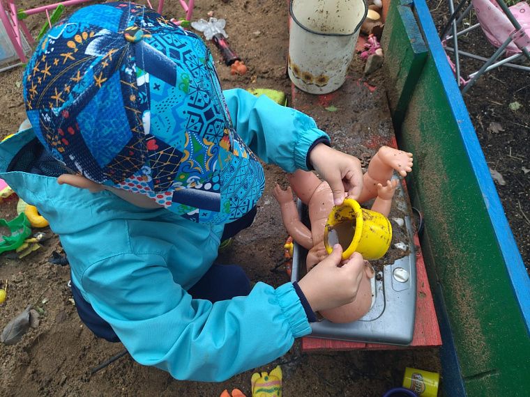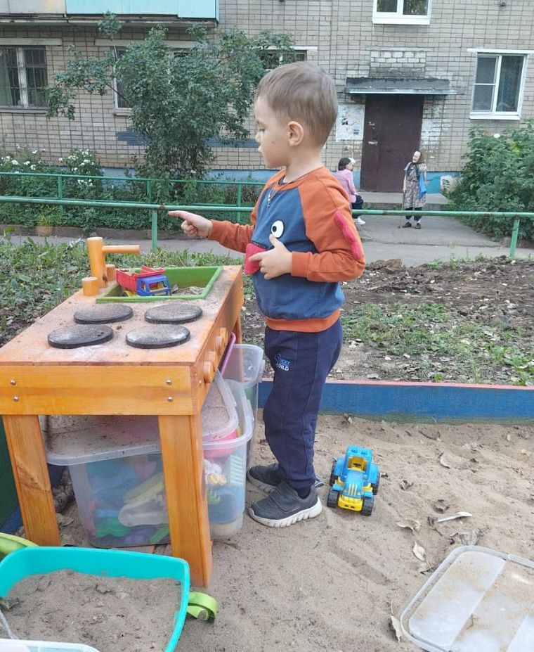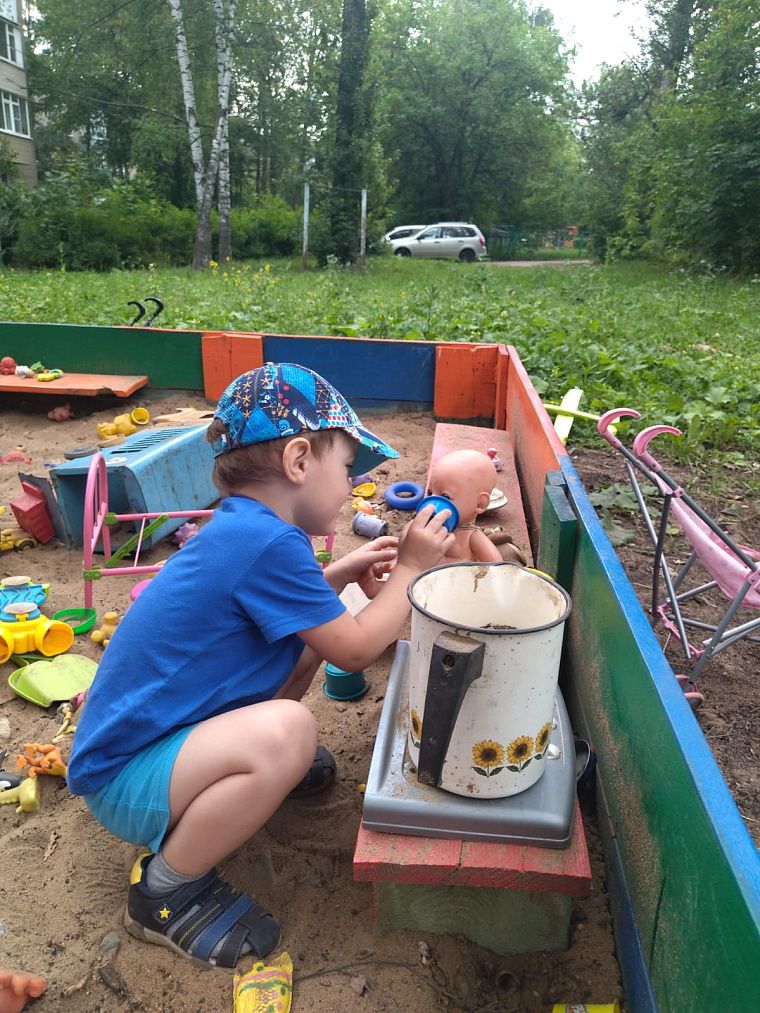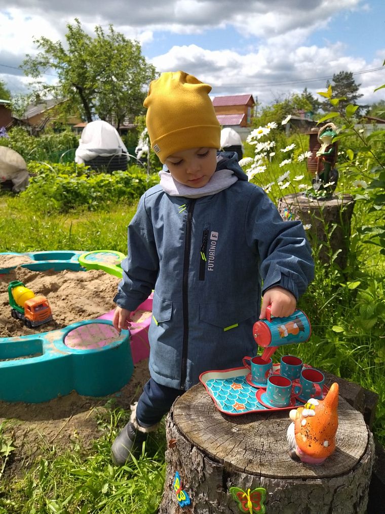 На улице, в песочнице и на даче также не забывал свою любимую игру – заваривал чай для гостей, насыпая различные цветочки, кормил пупсов кашей собственного приготовления.