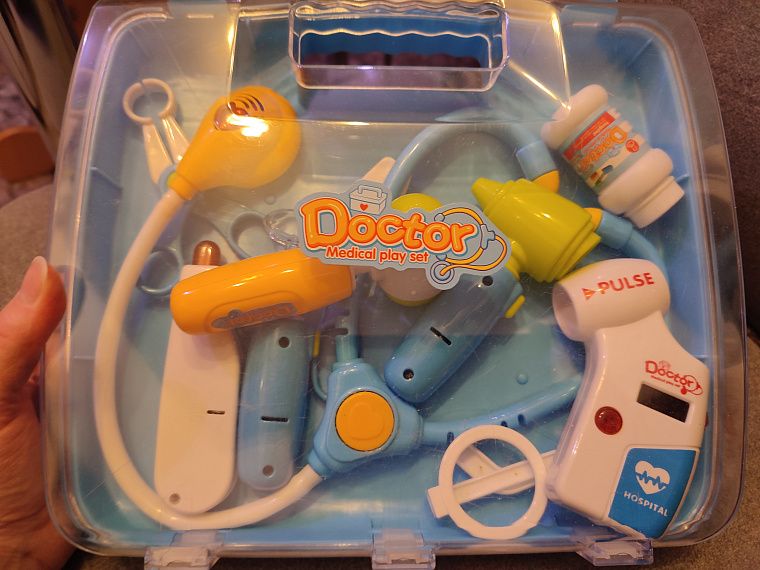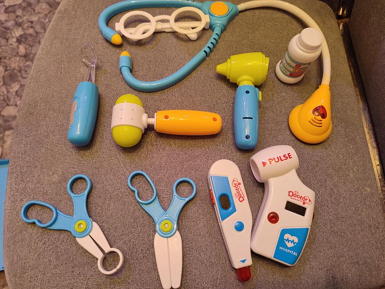 Очень мило, что батарейки входят в набор. Нажимаешь кнопку, и зеркальце подсвечивается, а, когда слушаешь, раздаётся звук, загорается свет. А уж молоточек для проверки рефлексов вообще потрясающий!