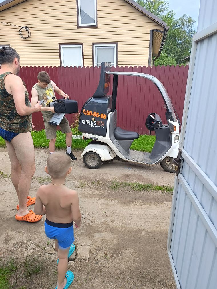 Вокруг гремело, сверкало и очень хотелось чего-то тёплого. Долго искали, кто же нам доставит еду на дачу, и нашли пиццерию.