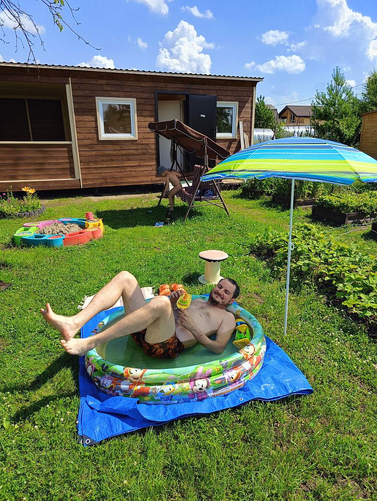 Утро было настолько жарким, что мы все по очереди плескались в нашем «огромном» бассейне, даже умудрились уместиться в него вчетвером, пока Мила спала. Когда дочь просыпалась, я шла заниматься ребёнком, оставляя сына на попечение папы. Наши мальчики, оставшись вдвоём, развлекали себя как могли.