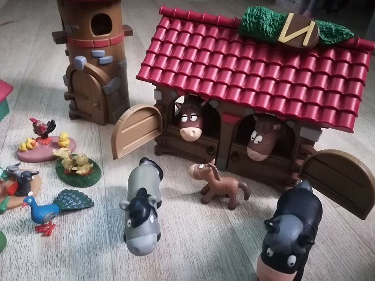 С тех пор один-два раза в месяц стали заказывать журналы с игрушками. Даже нам, родителям, стало интересно пополнять нашу ферму новыми обитателями, строениями и приспособлениями. Здесь есть и фигурки людей, живущих на ферме, и домик для них, и множество домашних животных и птиц, несколько диких животных, которые, согласно историям из журналов, обитают рядом с фермой, трактор, загоны, домики для животных.