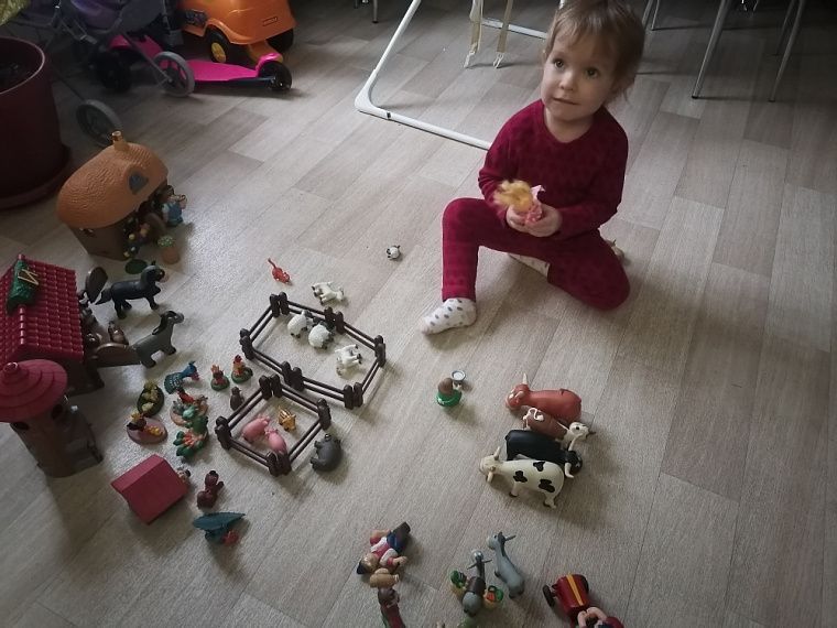 В последнее время, когда наша игрушечная ферма приобрела достаточно внушительные размеры, дочь проводит за игрой с ней всё больше времени. Она кормит морковкой кроликов, воображает, что на улице дождь и прячет животных по домикам, потом расставляет фигурки по загонам, ищет среди лошадок, коров и барашков, где чей детёныш.