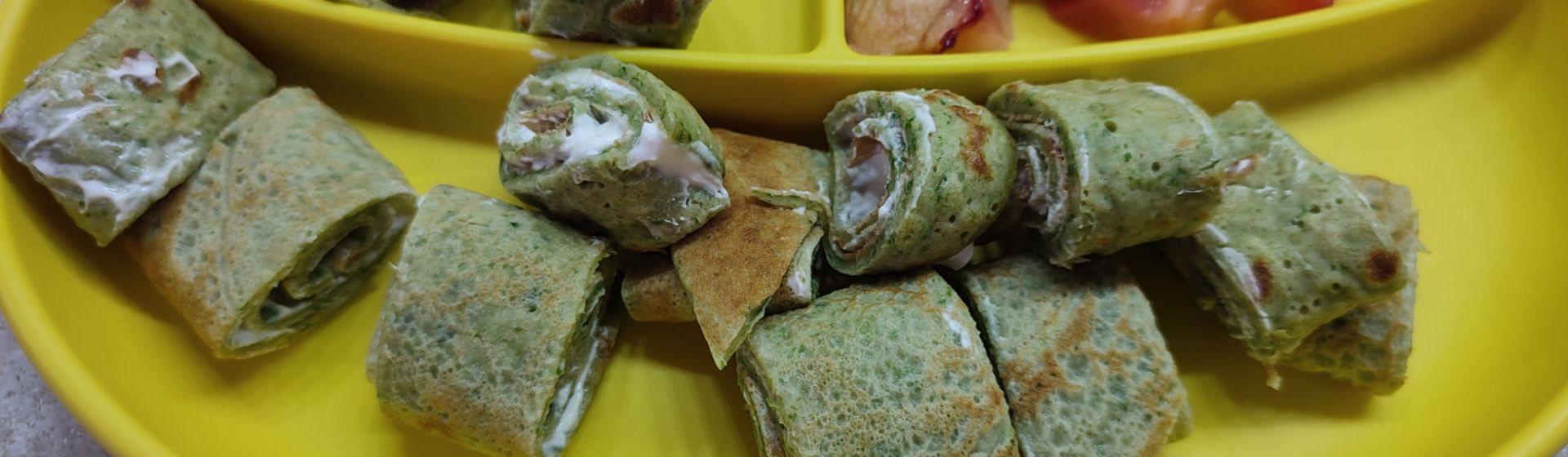 Горячие блины остужаем, смазываем творогом, сворачиваем рулетом. Для малышки я нарезаю на небольшие кусочки, чтобы ей было удобнее есть.