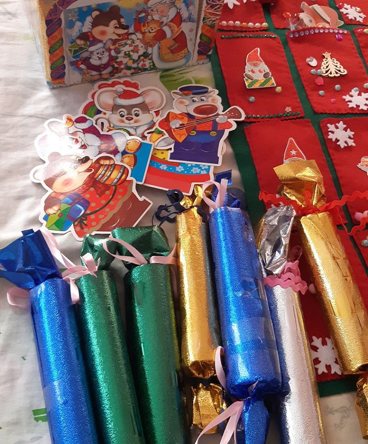 Наполнение адвента мне обошлось в 1000 рублей. Были куплены растущие кристаллы, развивающие игрушки на новогоднюю тематику. Также я обновила запасы цветной бумаги, картона, мишуры, дождика и прочих канцтоваров.