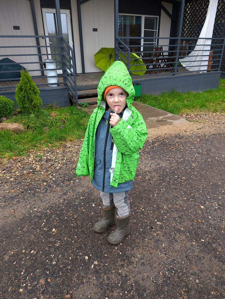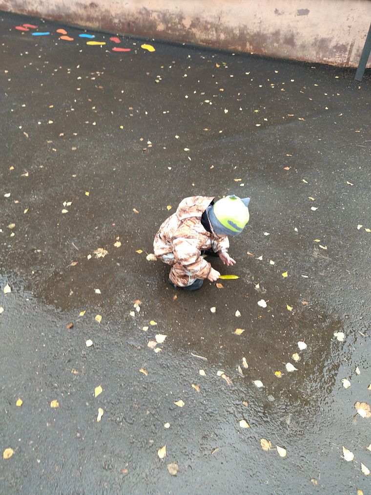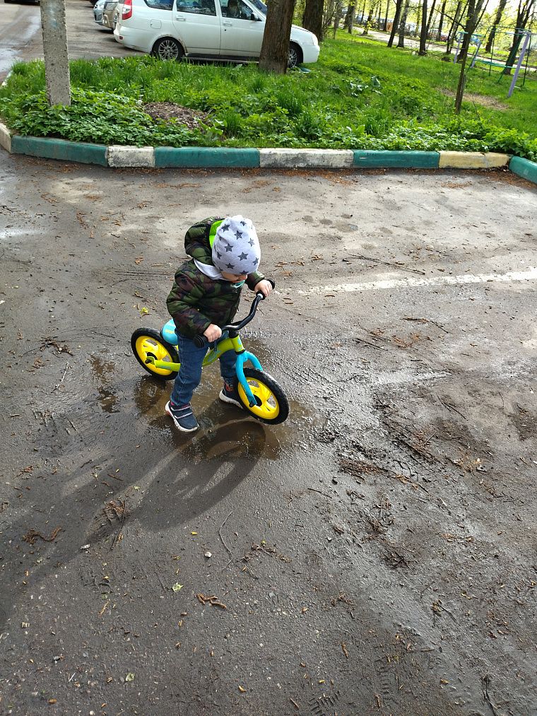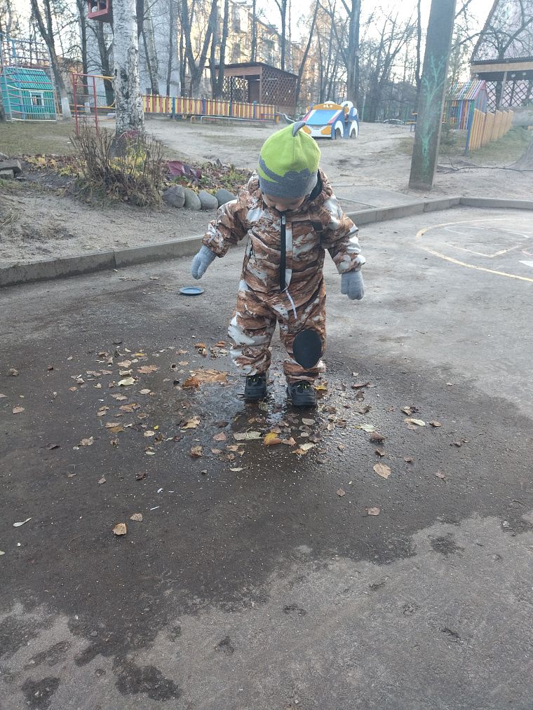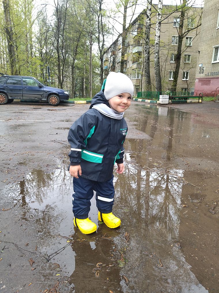 Если выходим на улицу после дождя, то стараемся всегда одевать сыну резиновые сапоги, так как знаем, что пройти мимо луж он не сможет, а если не разрешать, то он будет очень печален. Когда на пути много луж, то обязательно потопчется или постоит в каждой. Если гуляем с самокатом, то его колеса будут помыты в каждом мини-водоёмчике.
