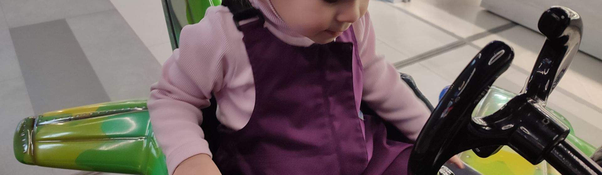 Самолёт качнулся и стал совершать движения верх и вниз. Пару кнопок в кабине можно было нажимать, и появлялся звук «пиу-пиу». Дочь сначала испугалась, но крепко вцепилась в штурвал и стала его крутить. Дома мы любим играть в машинку, крутить крышку, изображая баранку в автомобиле.