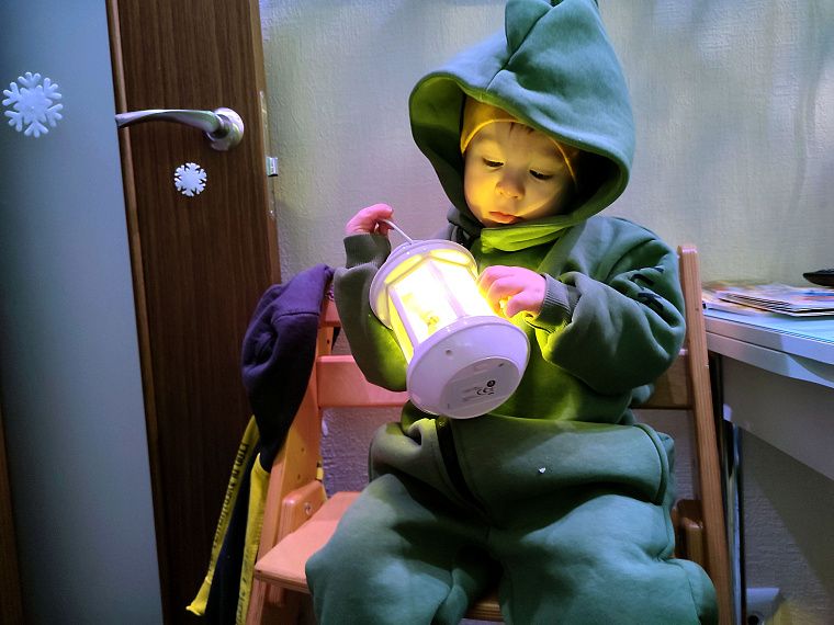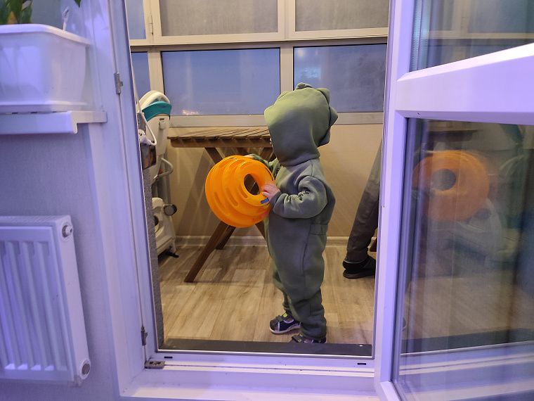 комбинезон – прелесть, просто дочери надо чуть-чуть подрасти. Дочь отказалась снимать комбинезон, и бегала по квартире, пугая кошку, не оставив нам выбора. Дома в таком комбинезоне очень тепло, и поэтому мы решили, почему бы сразу не поставить ёлку на балконе? Надев дочери шапку и обувь, мы приступили к выполнению задачи.