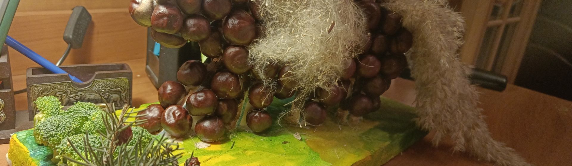 Поделка готова. На ваше усмотрение можно добавить на подставку природные материалы, мы использовали брокколи, крепили на зубочистки.
