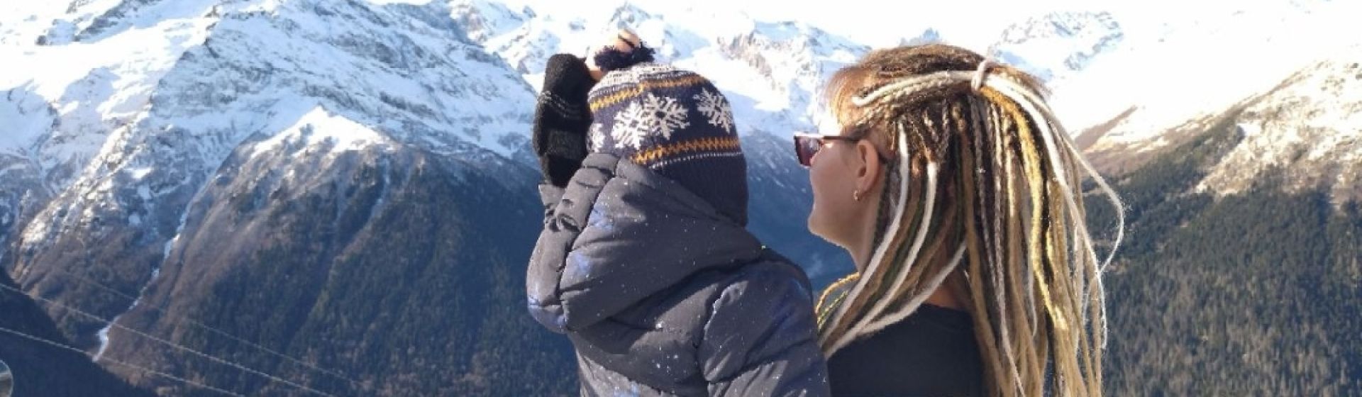 Перед нами открылся весь этот сказочный пейзаж. Действительно, Домбай нежный и дружелюбный, а Эльбрус властный и величественный, как мне и говорили. Мы кормили птиц, лепили снежки. Даже покатались на снегокате. Конечно же, мой маленький водитель нас уронил, и мы перевернулись. Видео у папы на телефоне знатное получилось.