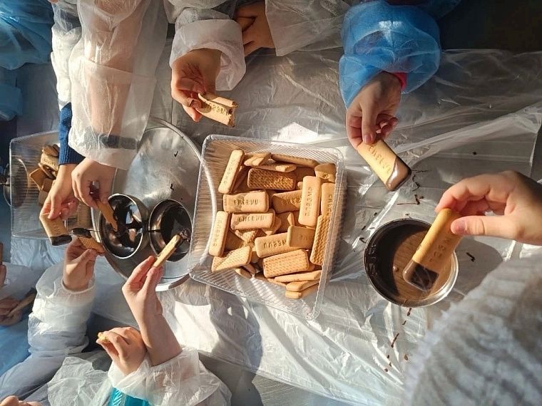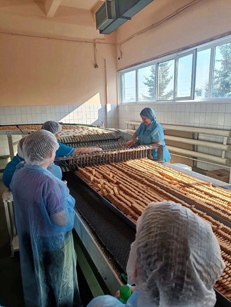 Дети своими глазами увидели, как замешивается тесто, как оно проходит несколько путей раскатки до тончайшего состояния в несколько миллиметров. А затем как специальная машина разрезает тесто на ровные аккуратные брусочки и отправляет его в печь.