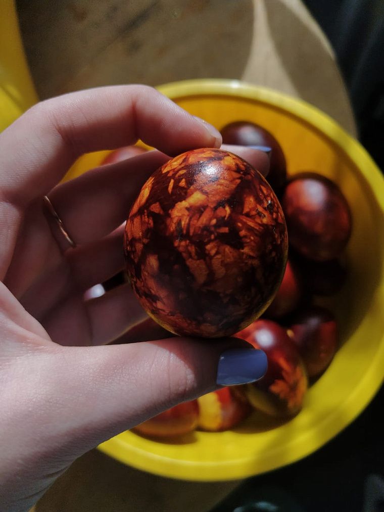 Приближение Пасхи чувствовалось с четверга страстной недели. Именно в этот день мы с мамой наводили порядок и чистоту в доме, а вечером, наконец, мы приступали к творческому процессу - окрашиванию яиц. С помощью луковой шелухи мы готовили три вида окрашенных яиц: обычные красные яйца, с рисунком и «мраморные» яйца.