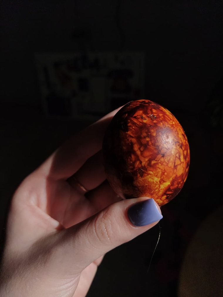 Самыми интересными и красивыми для меня были «мраморные» яйца. Для того, чтобы получился такой узор, мама измельчала луковую шелуху до размера семечки подсолнуха, смачивала яйцо и обваливала его в измельчённой шелухе.