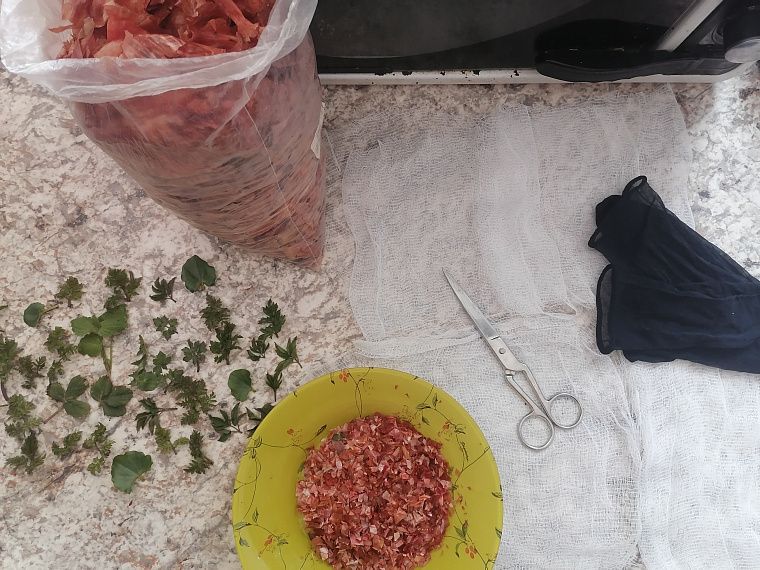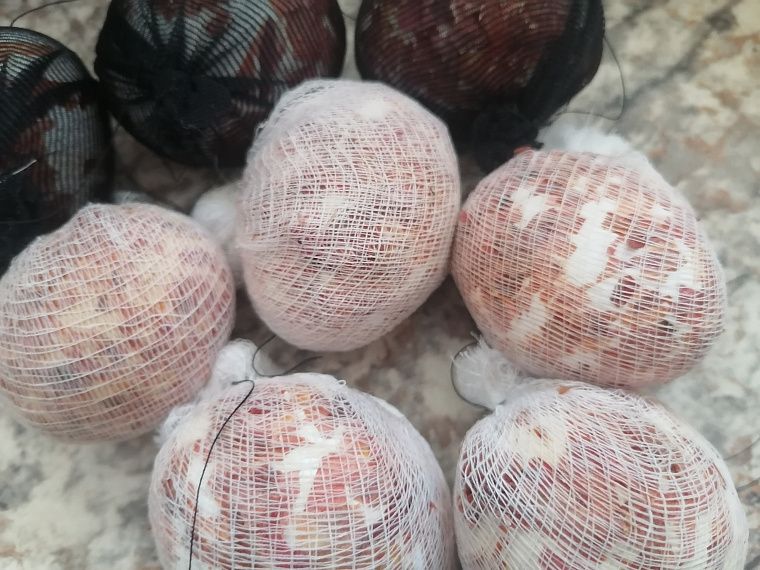 Такие мешочки с яйцами помещали в кастрюлю с холодной водой, луковой шелухой и столовой ложкой соли, после чего варили около получаса. Яйца остужали и освобождали от мешочка. На скорлупе оставались красивые «травяные» узоры.