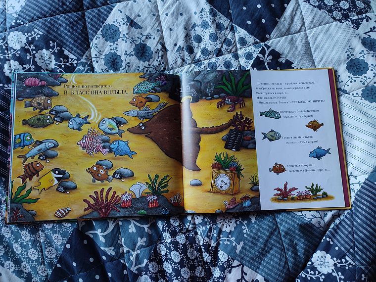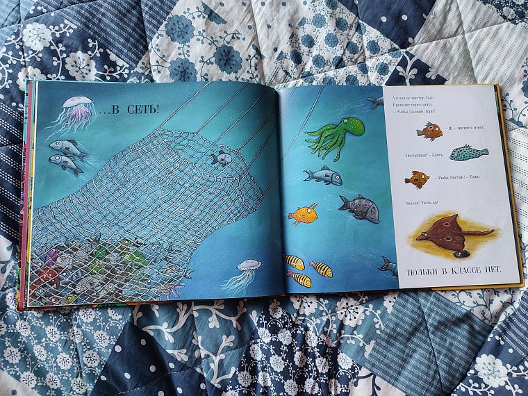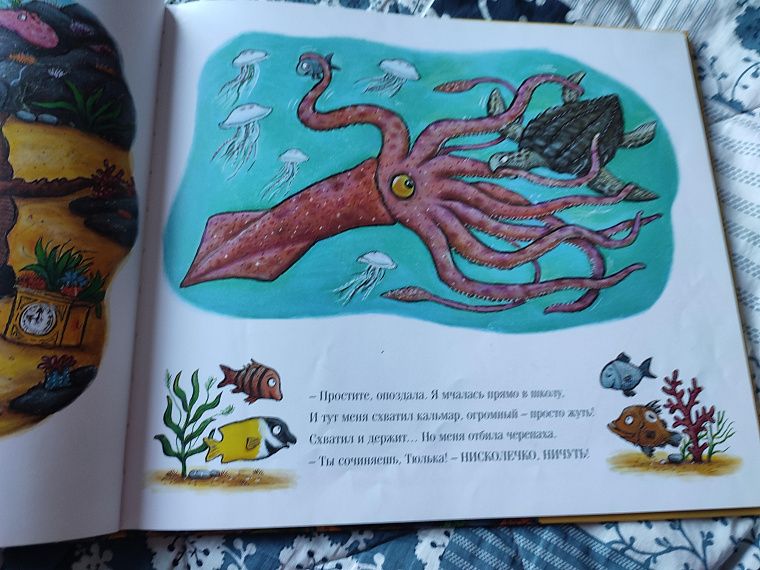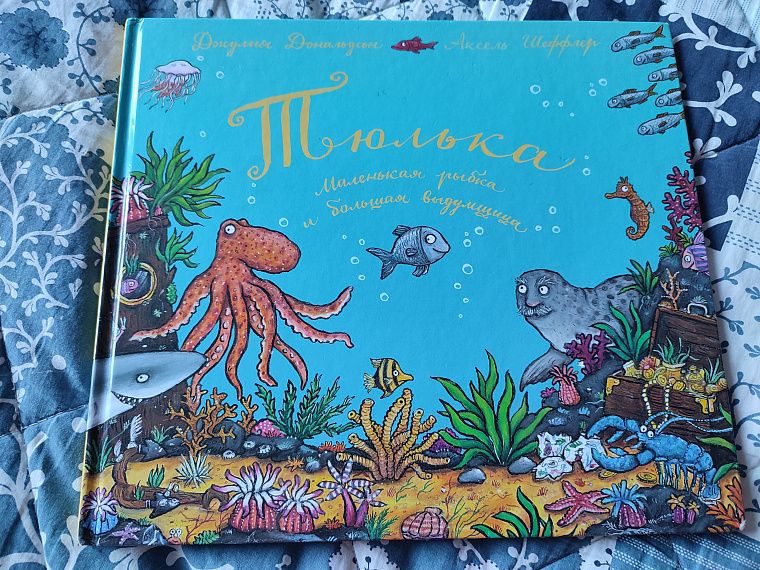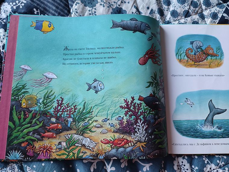 Аксель Шеффле создал чудесные иллюстрации, которые мы с дочкой с удовольствием разглядываем. А маленькая рыбка-тюлька начинает напоминать нашу дочь, которая тоже любит придумывать множество разных историй и красочно их рассказывать. Ведь при наличии детской безудержной фантазии даже обычный путь в школу может стать целым приключением для маленькой рыбки: катание на морском коньке, полёт на скате, спуск с дельфином к самым глубинам дна – и так каждый день. Тюлька придумывает сказки, и учитель ей не верит. Даже одноклассники говорят: «Чепуха», не верят, но тоже не все.