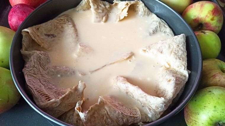 Сначала нужно обжарить яблоки, предварительно очистив их от кожуры и нарезав на мелкие кусочки. В сковороде растапливаем сливочное масло, затем засыпаем сахар и размешиваем до получения кашицы. На этой сахарно-сливочной массе нужно обжарить яблоки в течение 10 минут. Для получения заливки необходимо размешать все ингредиенты венчиком. Потом в кольце укладываем лист лаваша, затем яблоки, лаваш и заливка. Выпекаем 15-20 минут при 180 градусах.