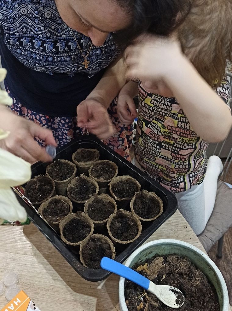 Для посадки семян использовали маленькие горшочки для рассады. Можно использовать торфяные таблетки для рассады. Но мы насыпали грунт и в углубления посадили семена. Между саженцами должно быть минимум 15 см. Увлажнили свои посадки и прикрыли пищевой плёнкой. Можно семена сначала положить на увлажнённую тряпочку, дождаться их прорастания и пересадить в ёмкости для рассады. Но мы сразу отправили их в грунт. Посадка пришлась на март (но рекомендуют сажать семена уже в феврале), на балконе было ещё холодно, поэтому оставили в комнате на полке, под лампами.