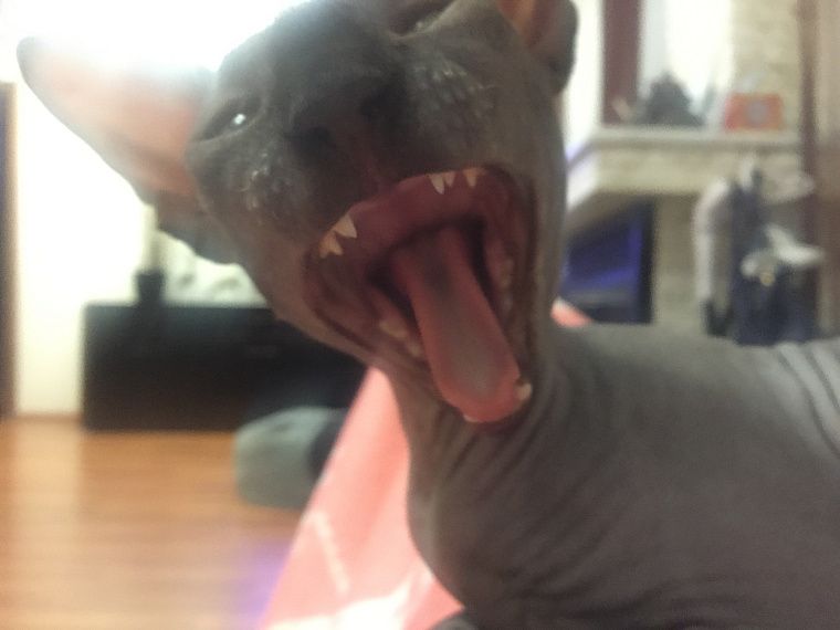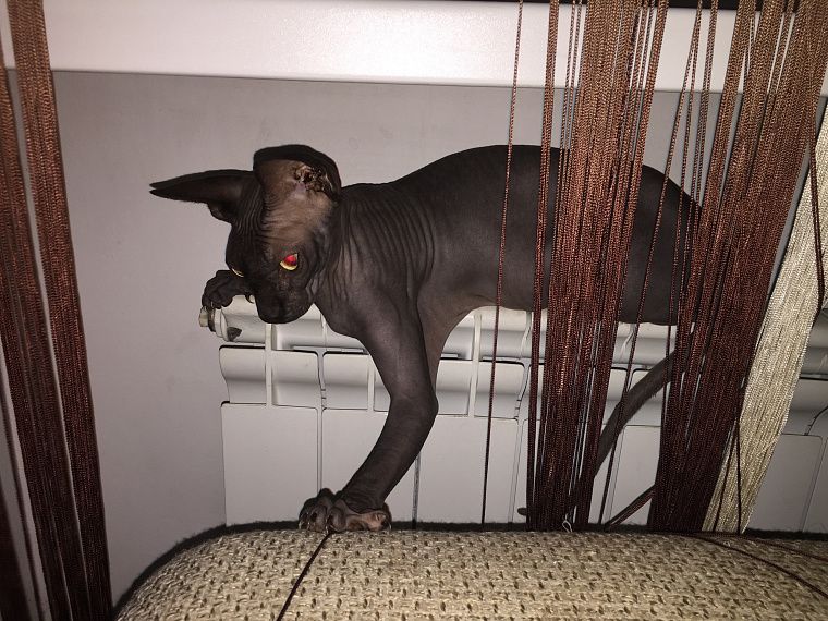 Единственный минус, который можно назвать в обиходе за канадским сфинксом – это то, что наша Моська оставляет повсюду шоколадного цвета следы от поверхностного слоя своей кожи.
