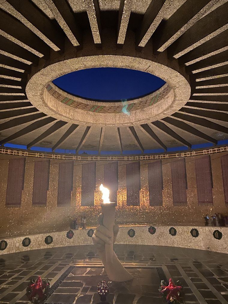 Во время второго своего посещения Мамаева Кургана мы дошли до Зала Воинской Славы (или Пантеона Славы). Это большое цилиндрическое здание, в центре которого находится вечный огонь. Чтобы подойти к нему, нужно по кругу обойти все здание. Стены здесь выложены мелкой мозаикой, на которой указаны имена всех солдат, погибших в Сталинградской битве, их 7200.