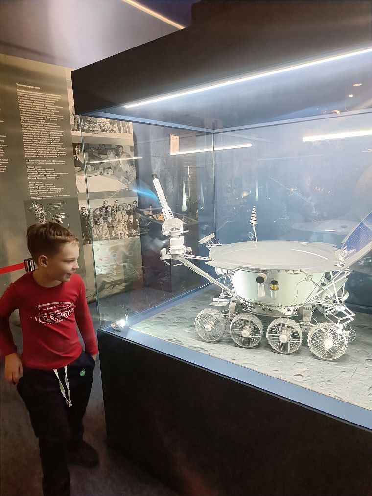 В первых залах содержатся экспонаты и информация о ракетных двигателях с подробным описанием. Немного скучновато для детей, им хочется посмотреть разок и побежать дальше. А вот следующие залы оказались более увлекательными. Там представлены макеты космических кораблей, станций, луноходов, спутников, туалетов. Настоящие тюбики с космическим питанием, скафандры, перчатки. Есть интересное описание о животных-космонавтах, как им тяжело переносить полёт.